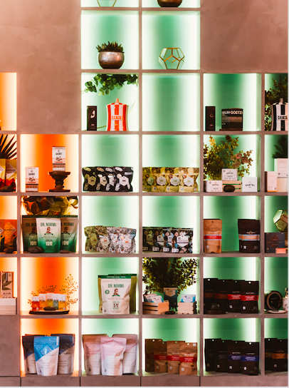 The boutique also sports stunning interior features designed by NB Studio’s Natalia Belonogova, including surreal sculpted overhead lighting fixtures and a large cube grid to hold the products on the side wall, illuminated by a rainbow of colored light.