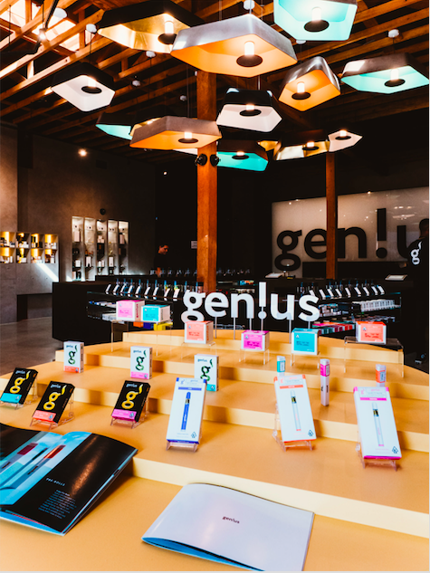 Featuring over 15 high-quality cannabis brands and product lines, the bright-hued new Gen!us dispensary is designed to specifically stand out against the typical dark green hued dispensaries, evoking curiosity among experienced and new cannabis users alike to come inside, as well as aiming to position the offerings in a new creative light. The centerpiece of the boutique dispensary includes a highly customized flower bar with bespoke fabricated bud-viewing magnifying jars to see and smell the beauty of each exotic cannabis flower.
