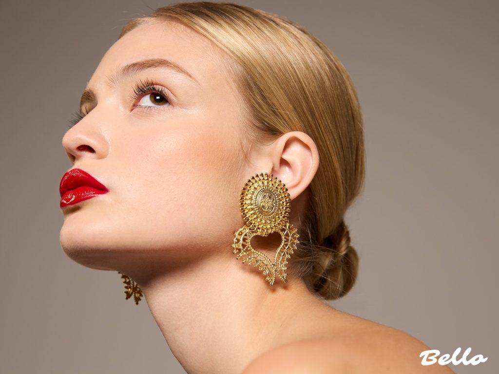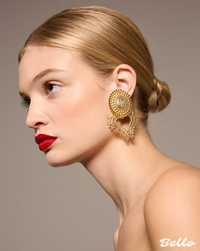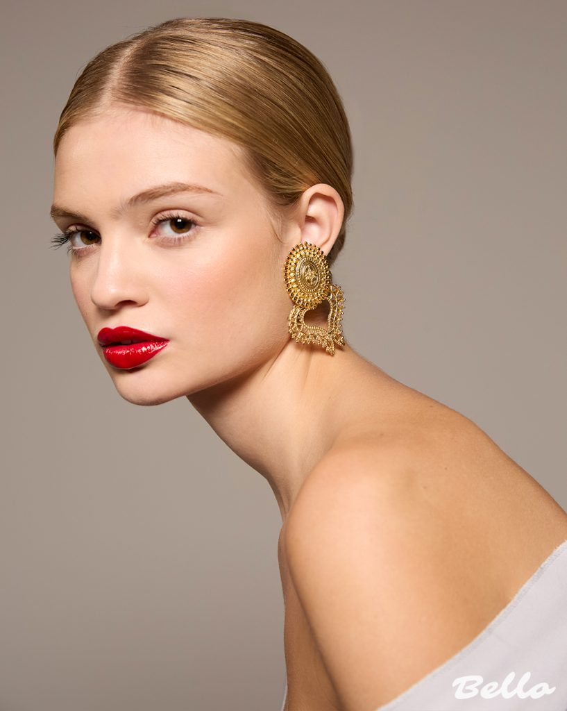Lips—drenched in a bold, lacquered red—demand attention, a modern contrast to the softness of the skin. The power of a classic red lip is undeniable: a symbol of confidence, seduction, and legacy. But the true masterpiece? The interplay of gilded embellishment. The earrings, ornate and intricate, dance between history and modernity, their golden filigree glinting against a backdrop of luminous skin.