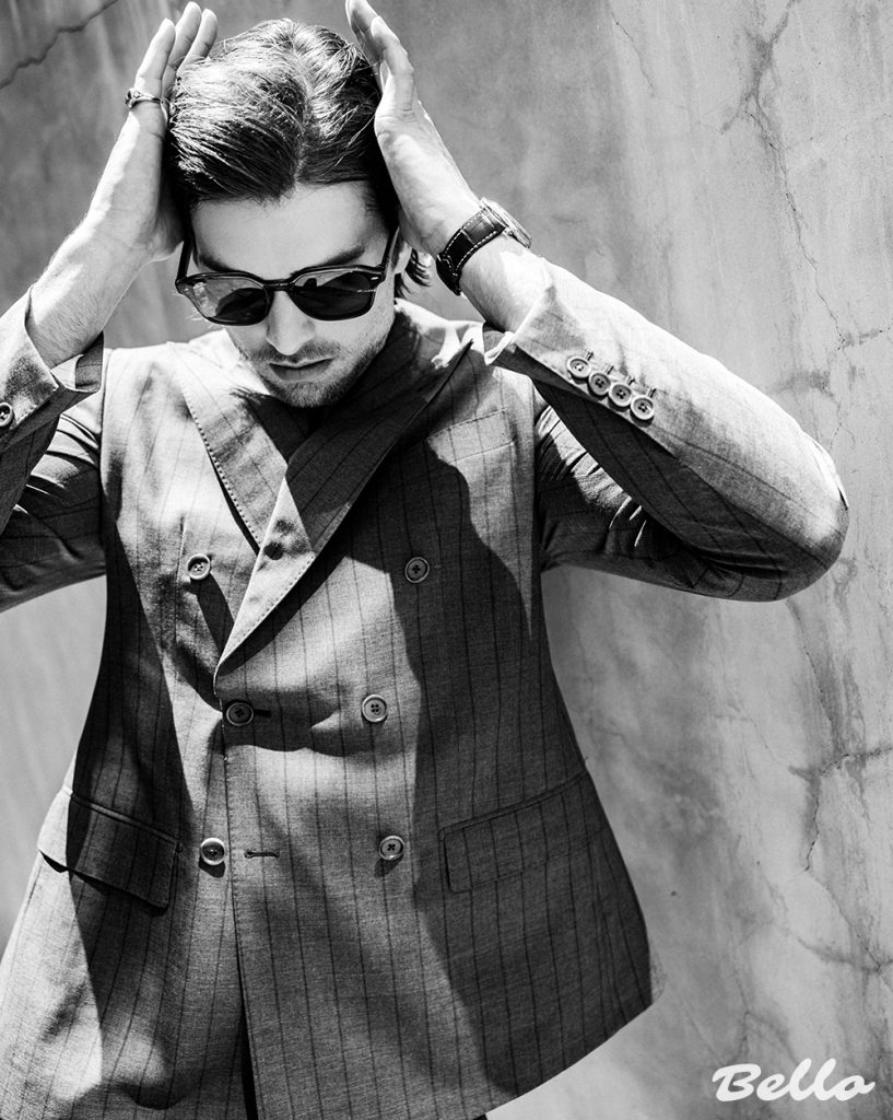 Cover Look: Grey and Brown Stripe Blazer VELASCA @velascamilano Pants VELASCA @velascamilano Black Loafer Shoes LOUBOUTIN @christianlouboutin Jewelry square necklace and oval ring – VENYX @venyxworld Dark Band gold face Watch PANERAI @panerai | Right: Tank KING AND TUCKFIELD @kingandtuckfield Pinstripe Pants SIMKHAI @simkhai