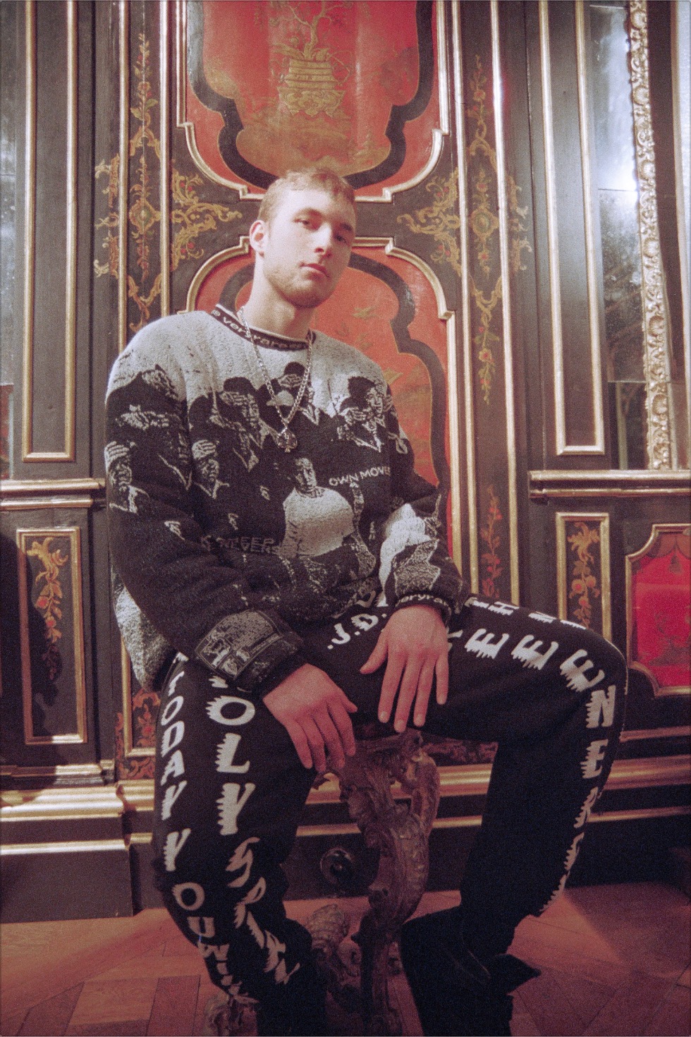 Raf Reyes, photographed by Oscar Dubois at the Gismondi Gallery (20 rue Royale, 75008 Paris) — Raf wears VERYRARE ‘Black Sheep//Maverick Mentality’ woven tapestry jacquard crewneck and ‘Myxoma-Dozed’ reflective tee